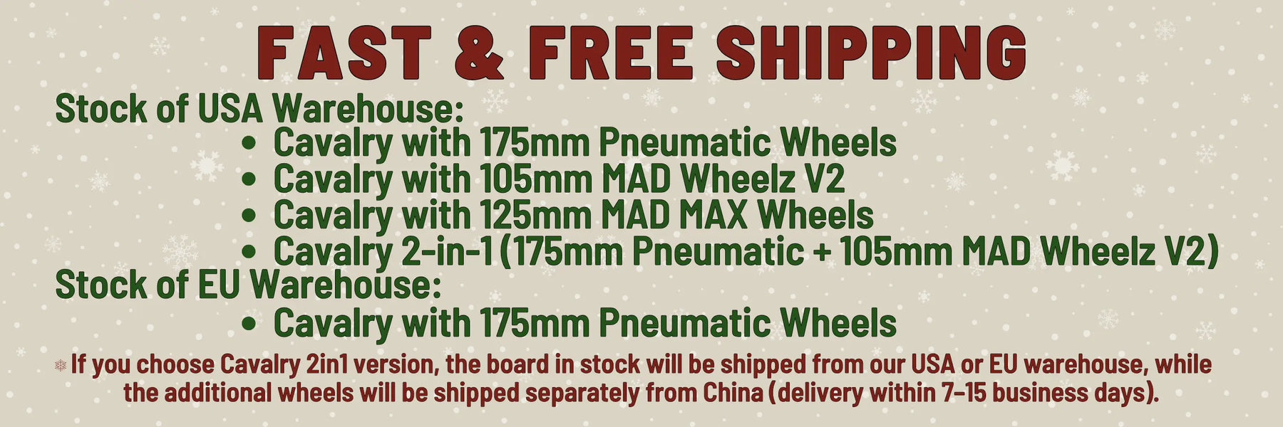 Cavalry 2 IN 1 (175mm Pneumatic Wheels + 105mm MAD Wheelz V2) and Cavalry with 125mm MAD MAX wheels are in stock at our USA warehouse, ready to fast ship to customers in the USA (excluding Hawaii, Alaska, Puerto Rico, and Military regions). And Cavalry with 175mm Pneumatic Wheels is in stock at our EU warehouse, ready to fast ship to customers in the EU countries (excluding Malta and Cyprus).