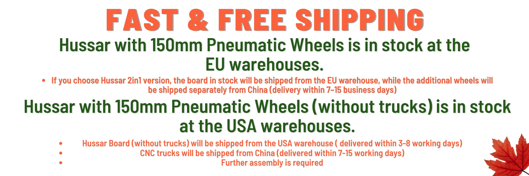 Hussar with 150mm Pneumatic Wheels is now in stock at our EU warehouse, and Hussar with 150mm Pneumatic Wheels (without trucks — trucks will ship separately from China) is also available in our USA warehouse. All in-stock boards are ready for fast & free shipping to customers in the USA (excluding Hawaii, Alaska, Puerto Rico, and Military Region) and the EU countries (excluding Malta and Cyprus).