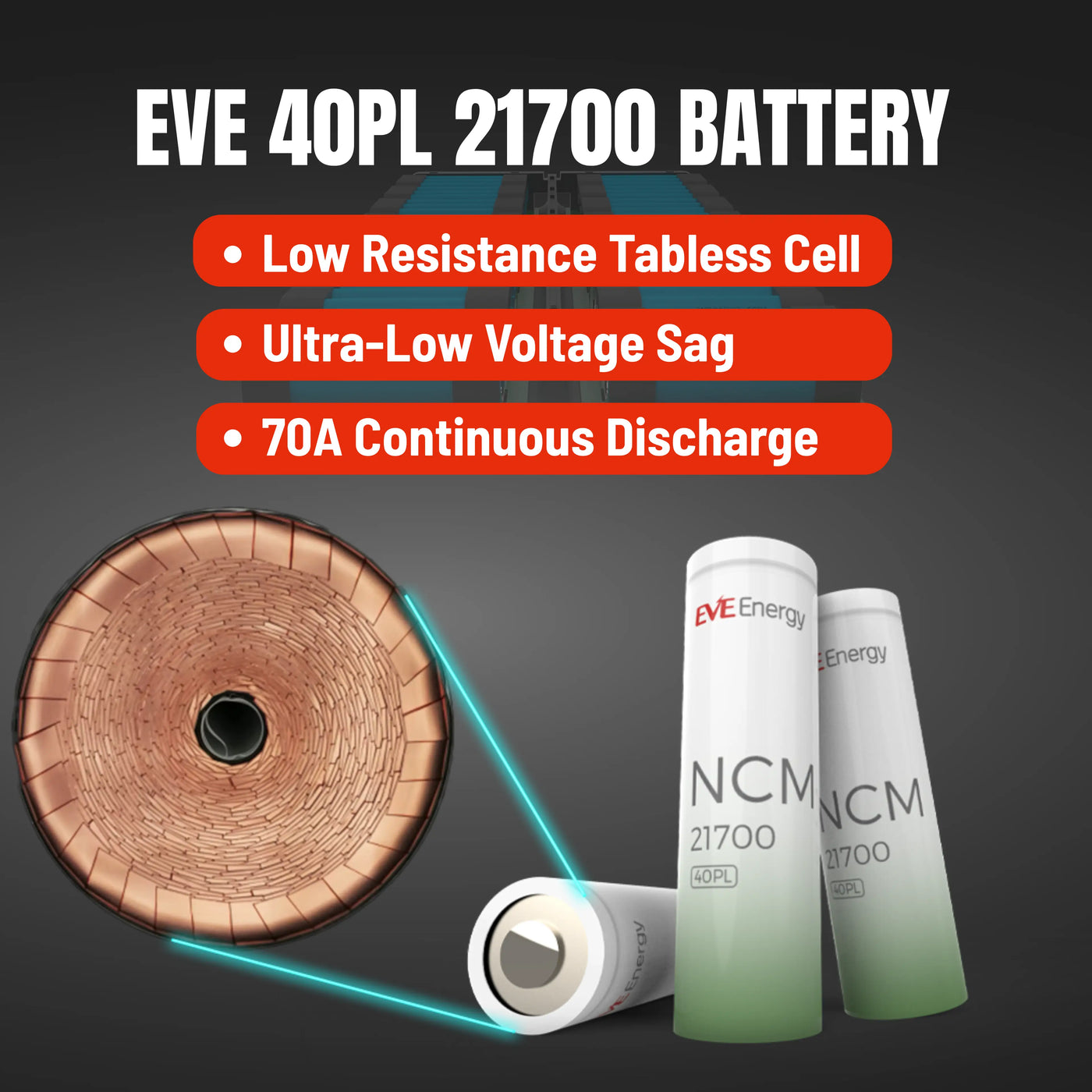 The EVE 40PL 21700 cell adopts an advanced tabless design that effectively eliminates the current bottlenecks caused by traditional tabs. It achieves ultra-low AC internal resistance (≤5mΩ), significantly reducing voltage drop (voltage sag) during high-current discharge and maintaining stable, efficient voltage output during high-current operation. With a continuous discharge rating of 70A and a nominal capacity of 4000mAh, the 40PL cell delivers stable voltage and reliable power output even under heavy load conditions. The minimized voltage drop ensures consistent performance and improved efficiency in applications requiring sustained high power, making the EVE 40PL cells deliver strong, consistent performance even when battery levels fall below 50%.