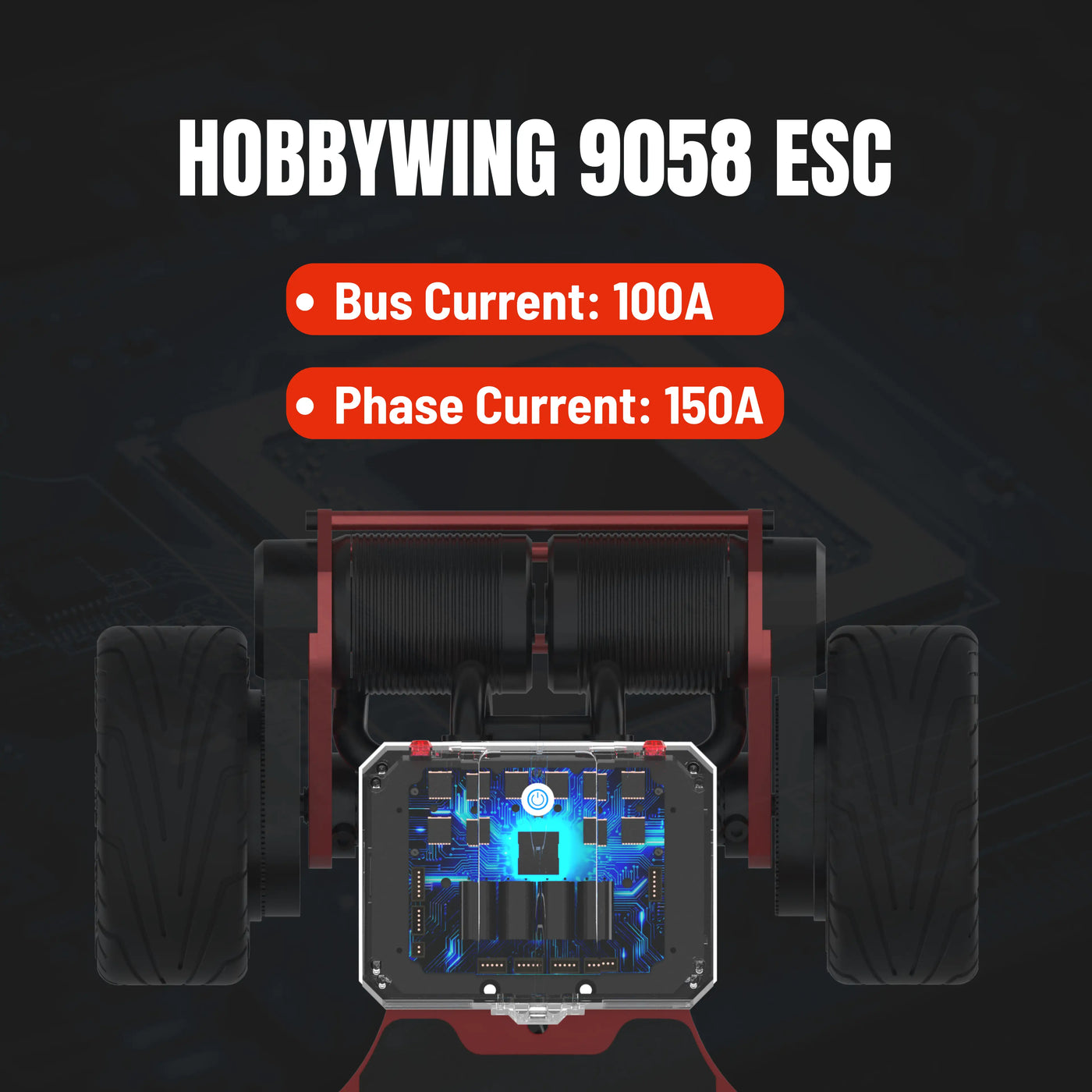 - ESC: Hobbywing 9058, bus current: 100A, phase current: 150A; Self-tuning & universal motor compatibility