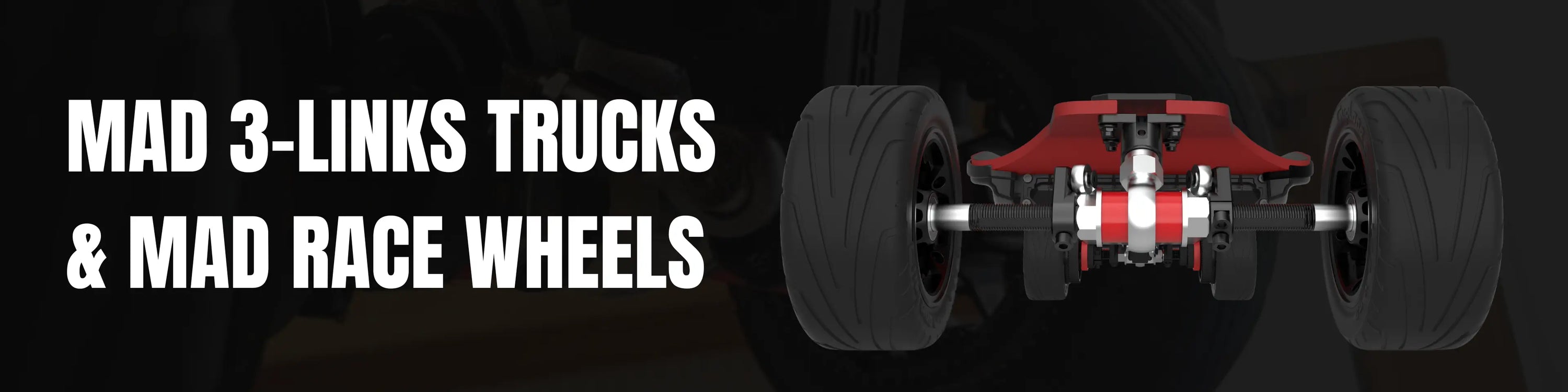 The MAD 3-Links trucks form the core of the Super Cavalry’s precise handling, blending the responsive carving of DKP trucks with the stability of TKP setups. Constructed from heat-treated 300mm B7 steel hangers designed to resist bending under normal use, and equipped with precision heim joints and spherical bearings, they deliver exceptional lean, leverage, and control. This engineering provides superior speed stability, smooth carving, and full adjustability, offering serious racers and DIY builders a level of performance and tuning potential that regular trucks cannot match.