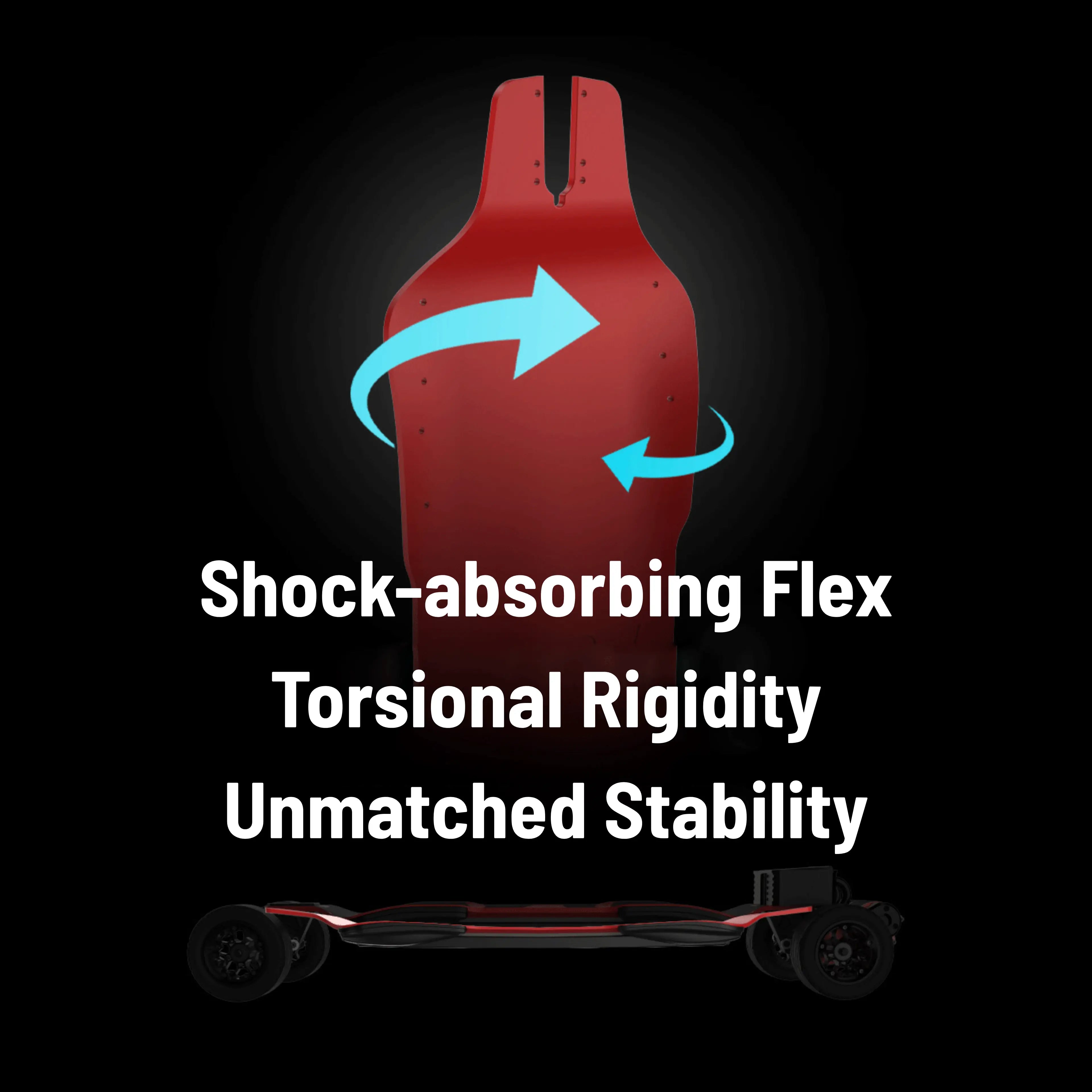 Super Cavalry features a premium composite flexible deck seamlessly paired with an armored aluminum-reinforced battery enclosure, engineered to deliver maximum stability, durability, and responsiveness even under extreme conditions. The deck provides controlled longitudinal flex to absorb vibrations and enhance comfort, while maintaining exceptional torsional stiffness that eliminates unwanted twist. This precision-tuned balance minimizes flex-induced energy loss, ensuring direct and predictable power delivery. This delivers unmatched stability, grip, and confidence, allowing riders to carve aggressively and push harder at high speeds.